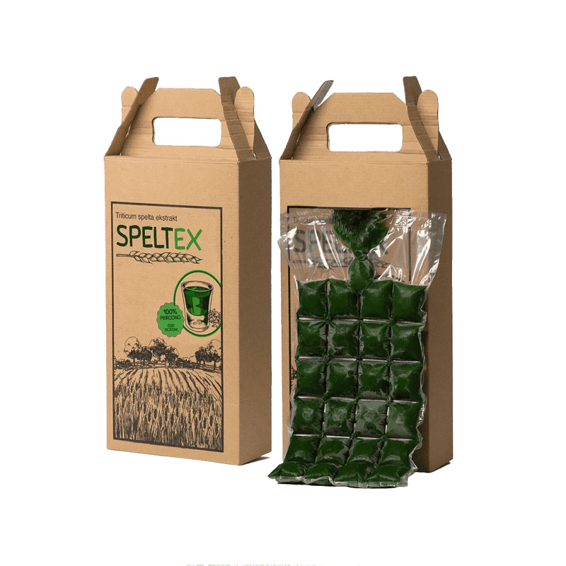 SPELTEX (sok od spelte) je čisti iscjedak iz mlade trave žitarice spelte (triticum spelta). Proizvodi se uz minimum obrade (hladno cijeđenje i momentalno zamrzavanje, bez dodavanja aditiva), čime se omogućava da u sebi sačuva visoku koncentraciju inicijalno prisutnih nutrijenata. Obiluje vitaminima, mineralima, mikroelementima, hlorofilom i enzimima u koncentraciji koja, vodeći se odredbama Zakona o bezbjednosti hrane i odredbama EFSA liste (European Food Supply Association), čini da se proizvod može kategorisati kao 100% prirodni suplement