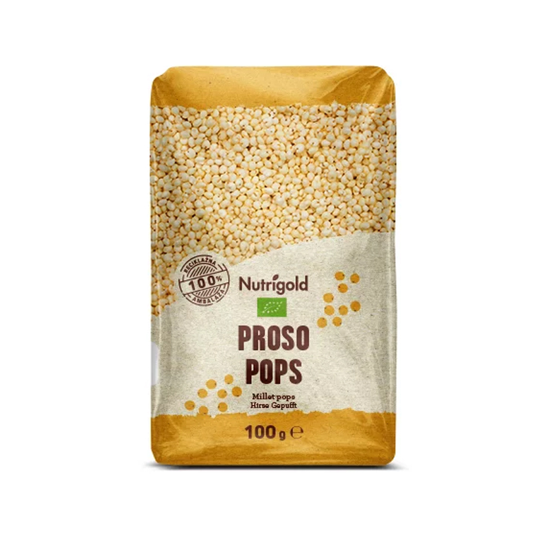 Nutrigold proso pops je 100% organski ekspandirani proso iz ekološkog uzgoja. Savršeno pahuljast, lagan proizvod izvornog sastava jer ne sadrži dodane šećere i soli. Zbog bogatog udjela ugljenih hidrata Nutrigold proso pops je idealna opcija zdravog doručka koji će vas ispuniti pozamašnom količinom energije.